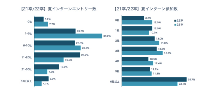 以下为教育支援NPO组织EN-COURAGE在8月实施的面向上位学校22卒学生的调查问卷数据。与去年同时期21卒学生88%的参加率相比,22卒学生的夏季实习参加率为91.2%,并且4个人中就有1个人回答参加了“6家企业以上”的夏季实习。