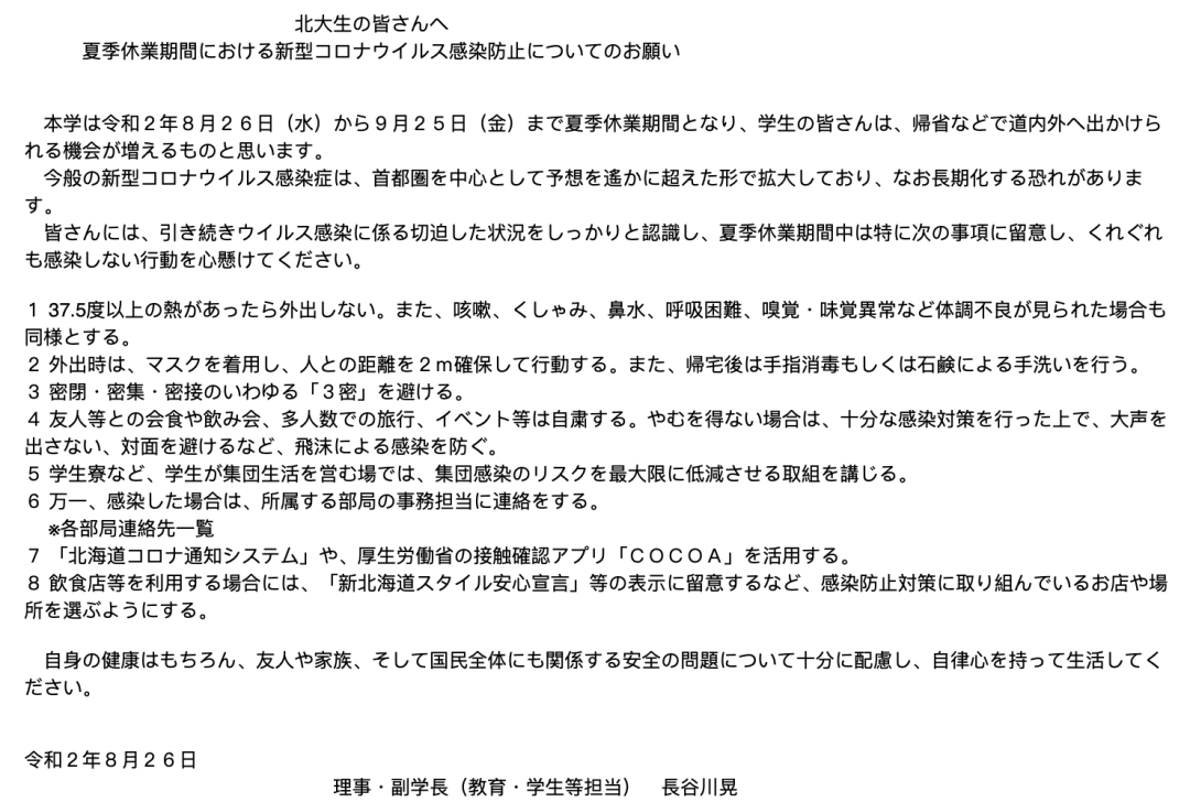 8月26日,北海道大学发布了关于暑假期间防范新冠病毒的通知。通知主要内容如下: