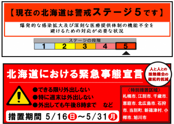 针对目前的北海道疫情,政府将北海道的警戒等级上调至最高的5级,并于16日发布了“紧急事态宣言”。其措施包括:呼吁市民避免多人聚集、减少出行;要求餐厅等休闲娱乐场所缩短营业时间;部分中小学校暂时休课;完善医疗体制等主要内容。本次“紧急事态宣言”将从5月16日开始,一直持续到本月31日。