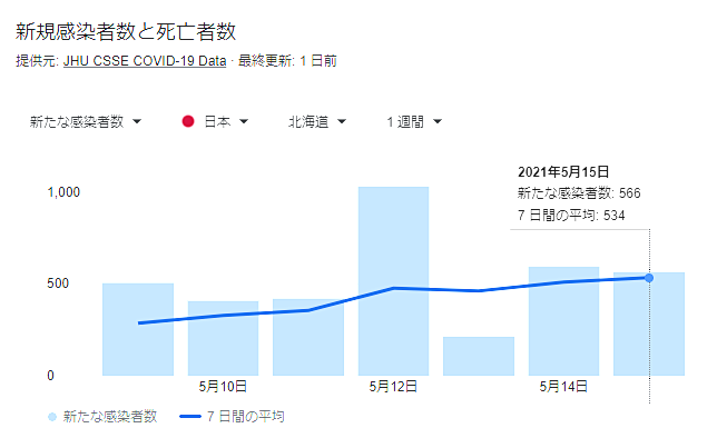5月15日,北海道新冠肺炎患者人数为566人,感染人数累计达到29,911人。另外,由于札幌受变异病株的影响,所有公共场所的感染风险都非常高。尤其在五一黄金周过后,疫情情况更是不容乐观。变异型病毒具有惊人的感染力,截至5月16日,札幌市的单日确诊数已达到322人,这已经是札幌市连续第五天单日新增确诊数超300人。