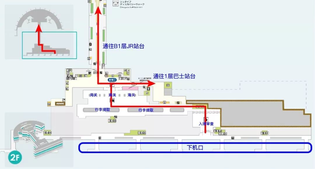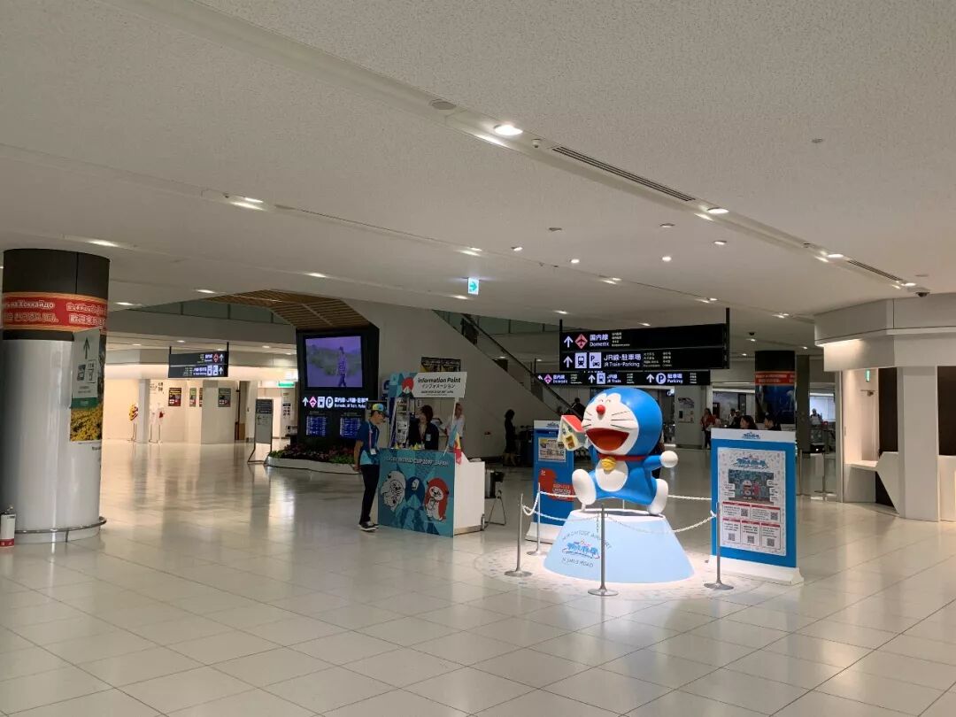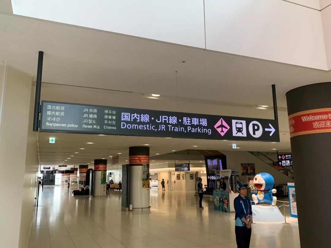 从到达出口出来,沿着路直走到JR站指引路标后右转(路标旁有一只哆啦A梦)。