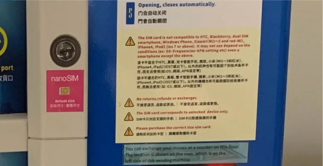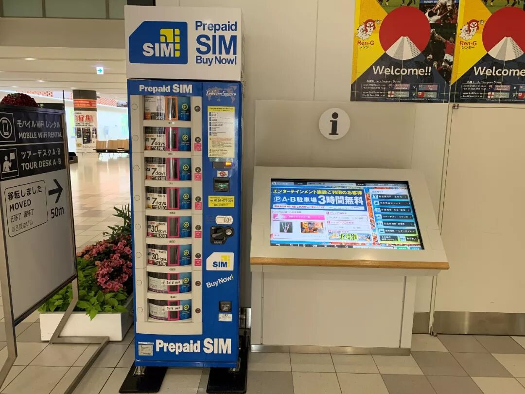 新千岁机场的手机卡自动贩卖机位于到达出口的问讯处附近。临时手机卡不适用于HTC,黑莓,双卡智能手机,微软,小米(MI1~3和红米),iPhone4,iPad2(iOS7或以下)。并且,非全网通手机也有可能无法使用。
