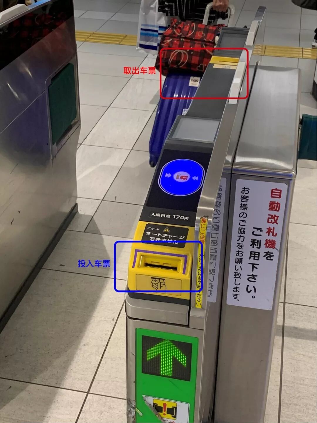 买完票后,将车票投入黄色投入口。通过装置后不要忘记取出车票。下车时出站需要将车票投入出站装置。