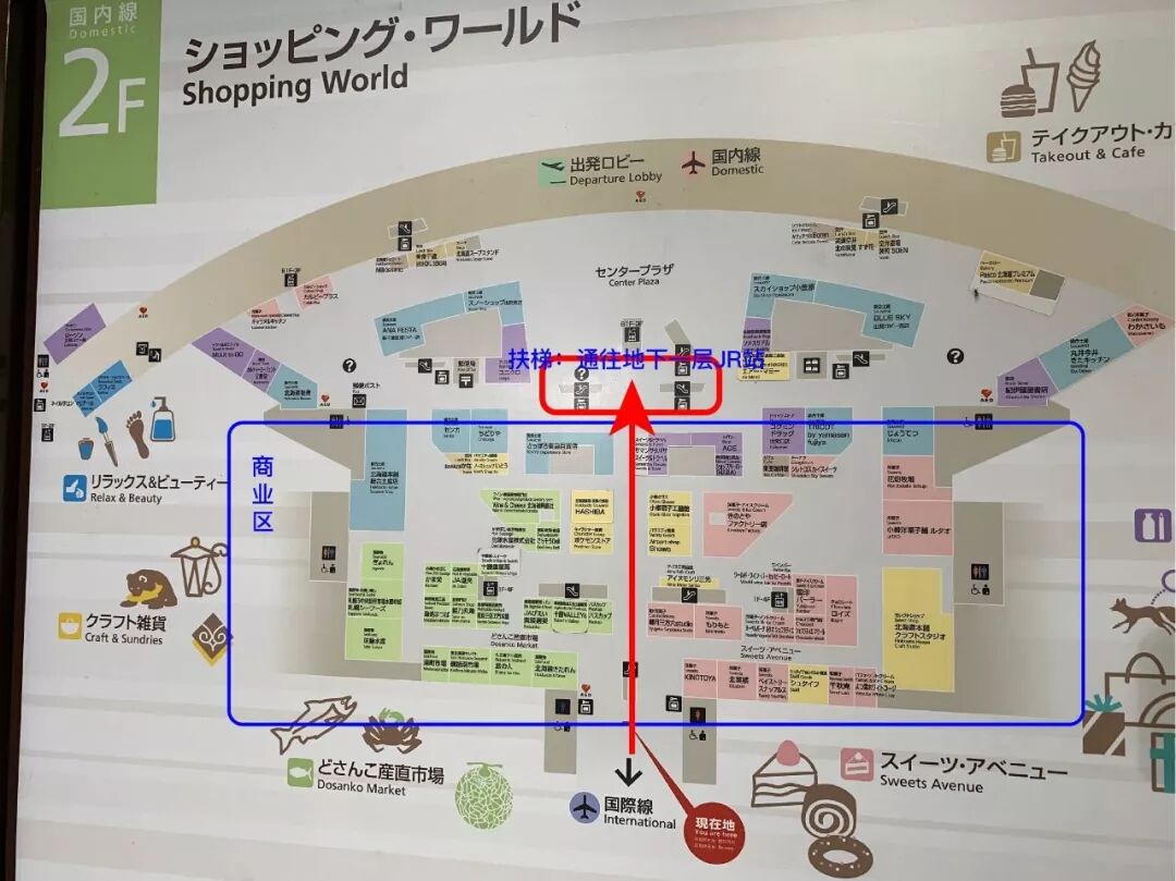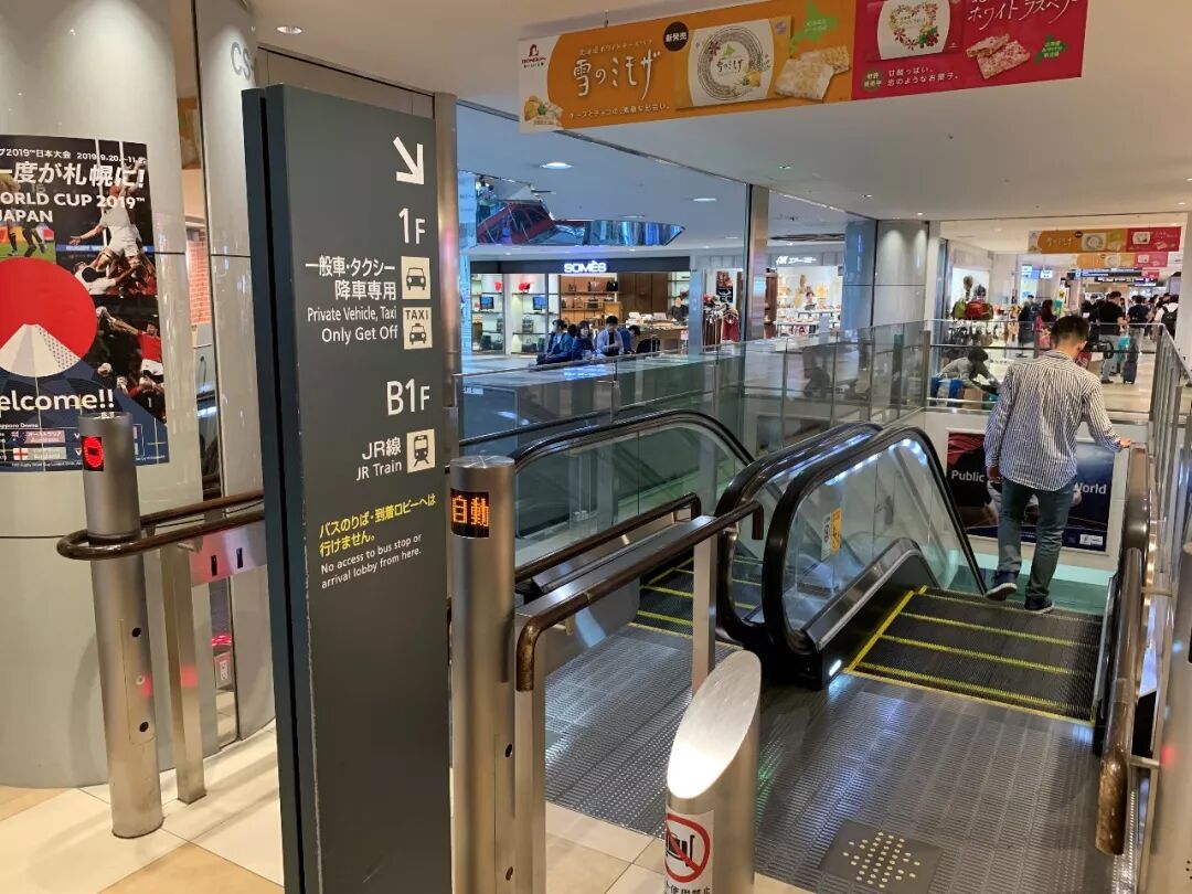 继续直走穿过商业区,便可看到前往地下一层JR站的扶梯。