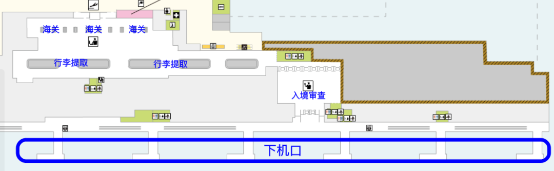 出站按图所示依次通过入境审查,行李提取与海关申报。