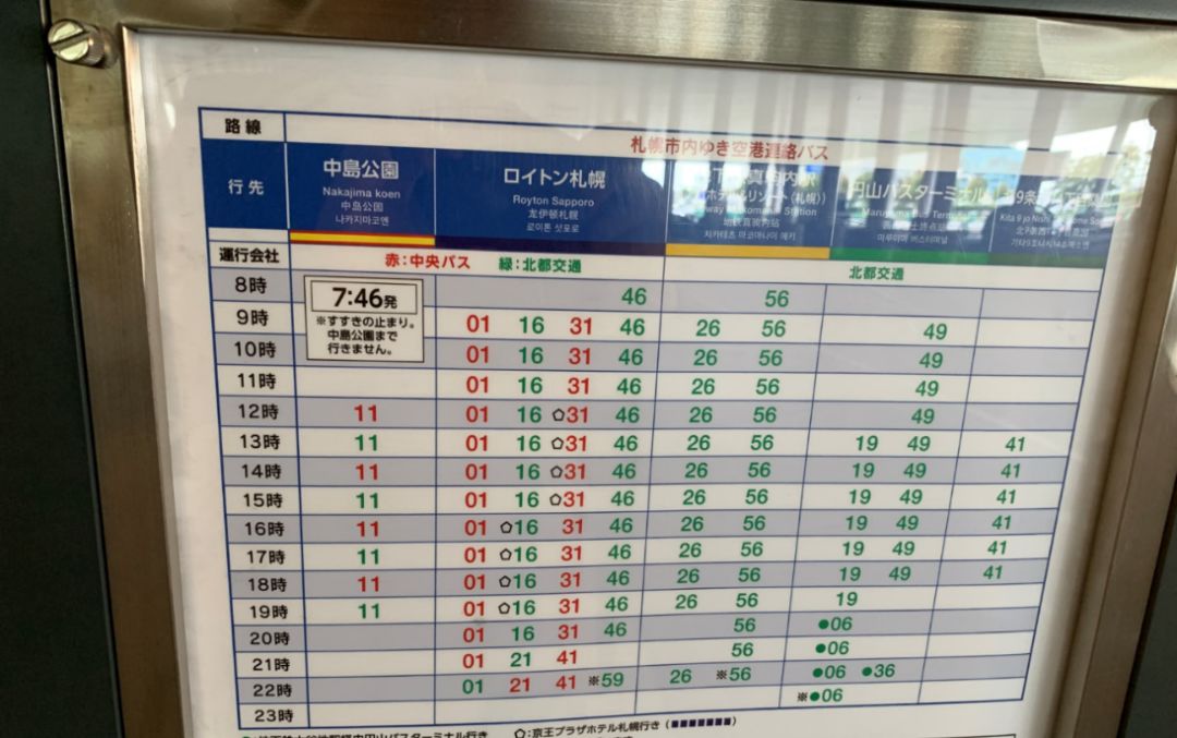 购票在写有乗車券的红白机器处进行。购票机右侧的显示器上写有各个线路巴士的班次信息。通往札幌市中心(札幌都心)的线路都可以通往札幌站。