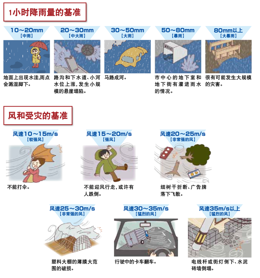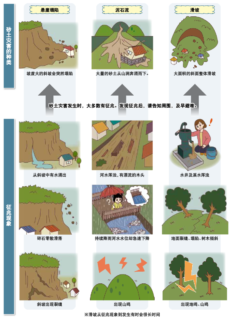 - 砂土灾害中自保。大雨时有发生砂土灾害的危险,降雨量达1小时20mm以上或已降雨100mm以上的情况,需要多加注意。