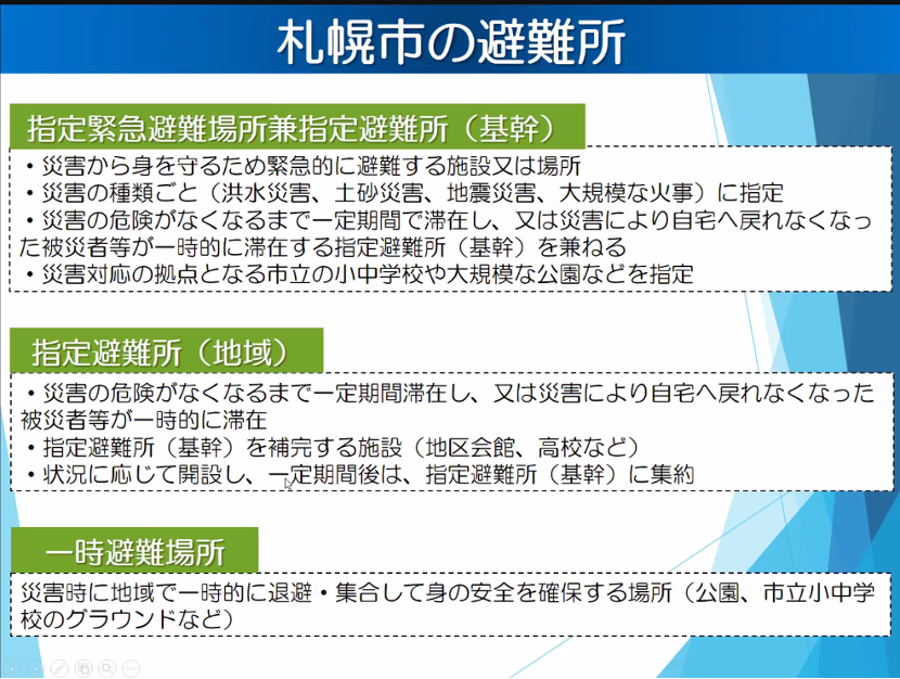 避难所是指因为灾害而无法回家的住民暂时停留的地方,比如中小学等。务必提前知道札幌市的避难所有助于灾害来临时的应对。