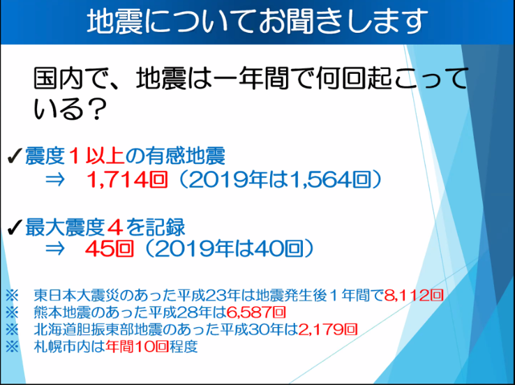 1. 地震に備える 众所周知日本是一个地震频发的国家,日本国内据数据显示,2019年一整年震度1以上的地震有1564次,札幌市内每年约有10次左右。最近的一次比较大型的地震是2018年北海道胆振东部地震。在这样的环境下我们需要做什么呢?