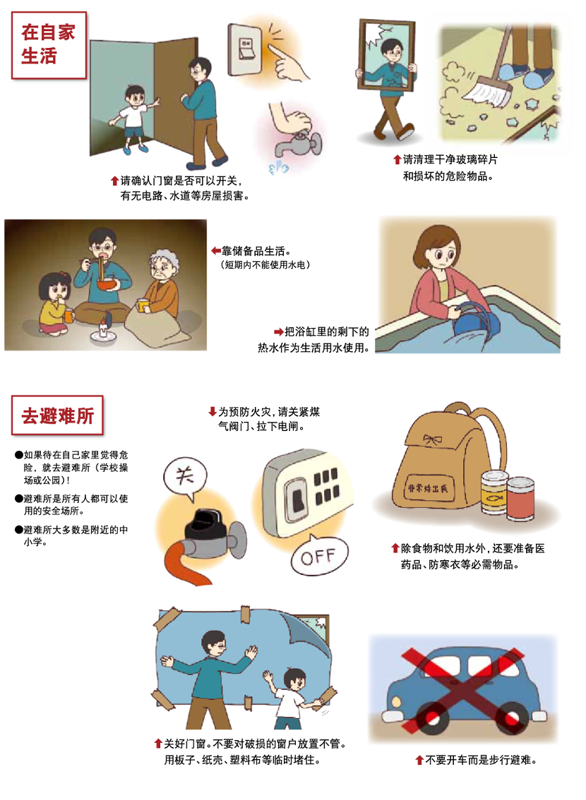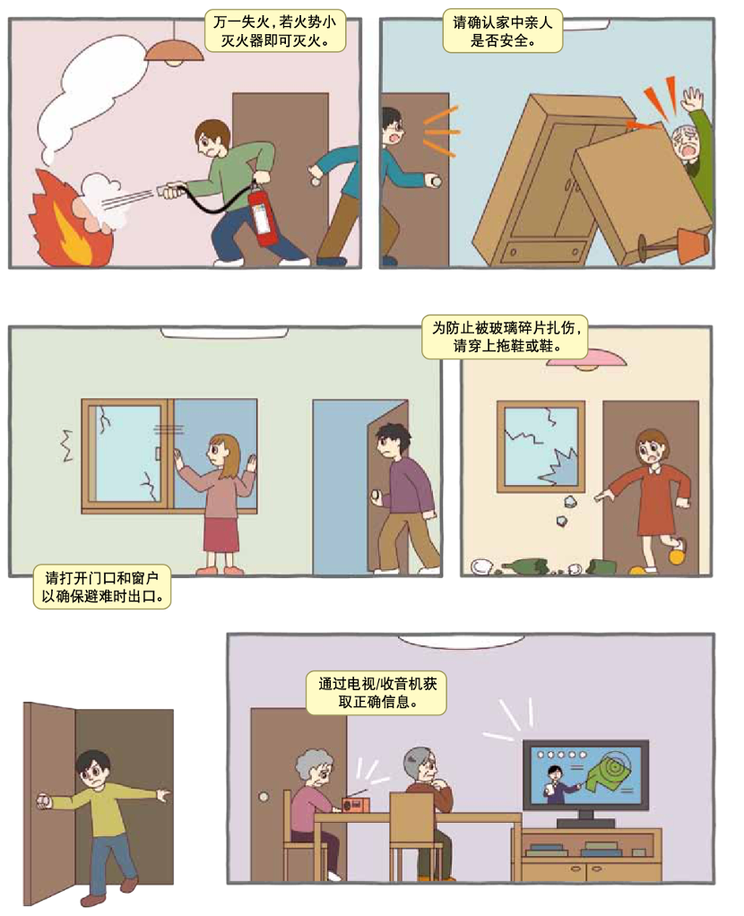 - 地震发生后数小时,预计消防和行政救助不能及时赶到,因此为了保护更多生命,家族和地域间的相互帮助极为重要。