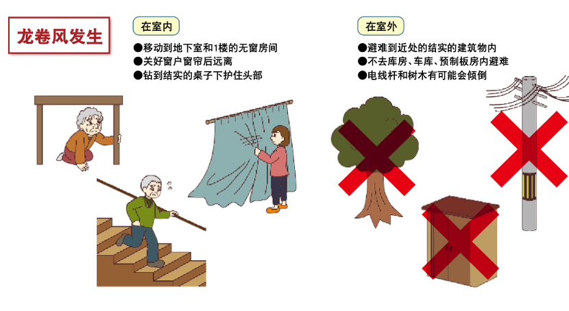 - 龙卷风中自保。伴随旺盛的积雨云而发生的龙卷风会引起重大灾害。龙卷风发生时,需要迅速采取自保行动。