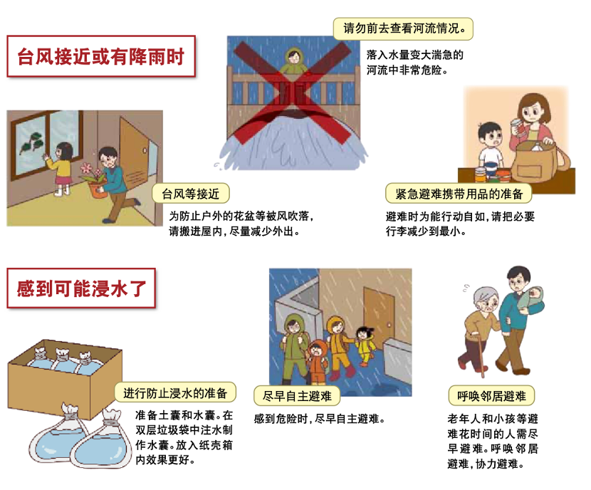 - 收集信息事先察觉危险。台风,大雨,融雪等原因引起的风灾和水灾,并不是突发的。所以除了日常防备外,收集气象预报等信息事先察觉危险是极为重要的。
