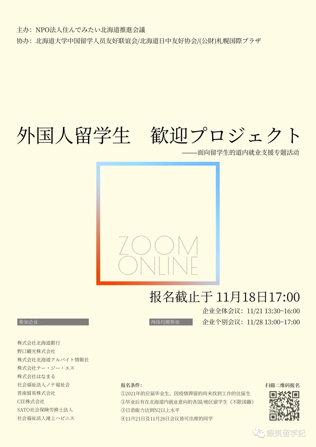 本次活动是由北大学友会联合北海道日中友好协会牵头道内各大企业/组织为大家开启道内就业支援的首次尝试,本次活动所积累的经验成果将对以后我们留学生在日就业支援活动起到很大的促进作用,希望大家多多支持并参与。最后,祝愿大家通过本次活动后都能找到称心如意的工作。
