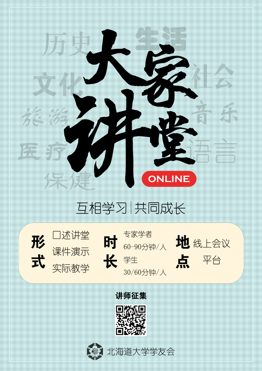 讲师报名:扫描下方海报 “讲师征集” 二维码 填写报名表