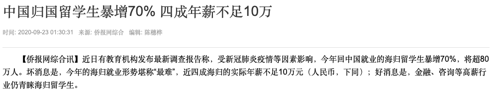 这时候会有同学考虑回国就职。反观国内的就业情况,据UniCareer发布了《2020海归就业力调查报告》,在疫情和就业移民政策收紧的双重压力下选择回国就业的留学生暴增7成人数达80万与874万国内应届毕业生,站在同一赛道的我们能拿到心仪的offer吗?