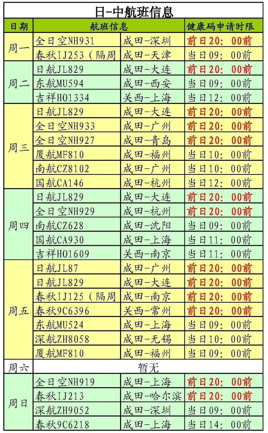 根据有关航空公司官网消息,2月日本往返中国(大陆)航线情况如下(供参考,航班具体情况以航空公司公布消息为准)。请计划赴华的乘客在获取检测证明后立即通过“防疫健康码国际版”微信小程序或https://hrhk.cs.mfa.gov.cn/H5/申请健康码并拍照上传检测证明原件,确保照片清晰、个人信息完整以利于尽快获得审核。
