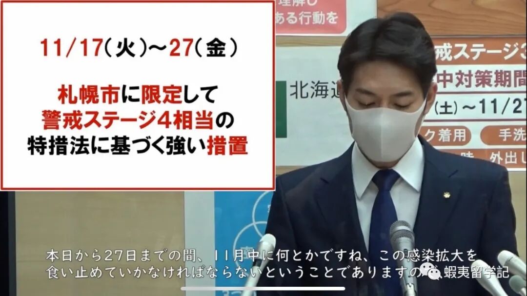 北海道11月7日至11月27日为集中对策时期,警戒等级为3级。11月17日下午,北海道知事和札幌市长进行了防疫对策的紧急会谈 ,札幌市的警戒级别提高到4级,并呼吁札幌市民非必要情况不要外出,以及札幌市外的民众非急事不要来往札幌。