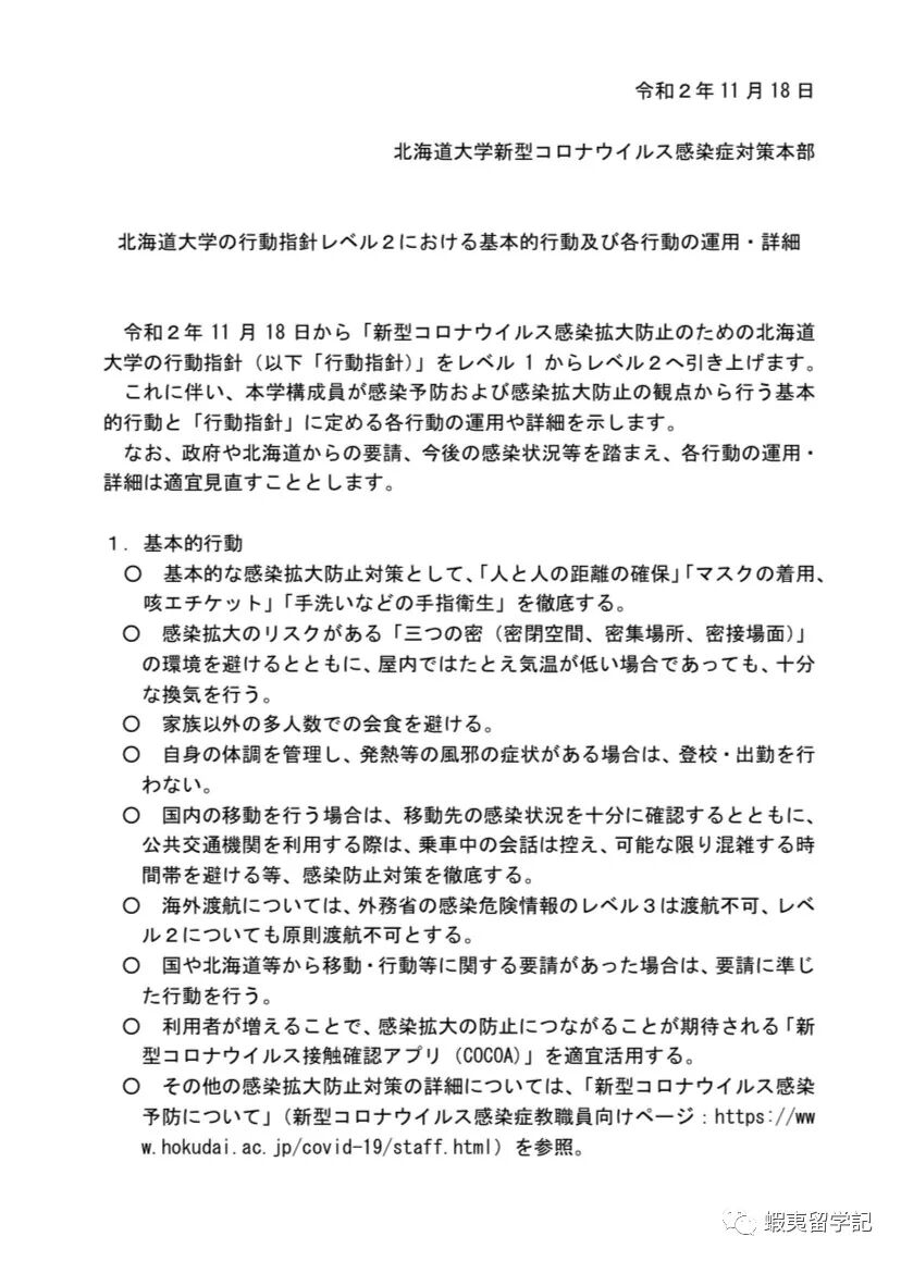 自11月以来,北海道发生了多起集团感染,除了疫情相对严重的薄野地区外,医疗场所,养老设施,乃至邮局等都有发生。北海道大学内也有多起教职工和学生感染。为了控制疫情,北海道大学从11月18日起,将《防止新冠状病毒感染传播的行动指南》从第1级提高到第2级,并提醒学生做好防护措施,减少课外活动,避免人群密集。