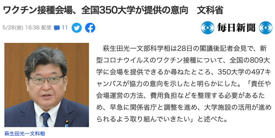 对于提供疫苗接种场地的大学,是否可以针对在校生及教职员工进行优先接种,日本政府此前已对此问题进行深刻的商讨。据最新消息,日本政府已和部分学校达成了优先接种的共识(近畿大学,广岛大学、仁爱大学已明确表态)。如现阶段的工作开展顺利,部分学校将可以于6月21日进行先行接种。