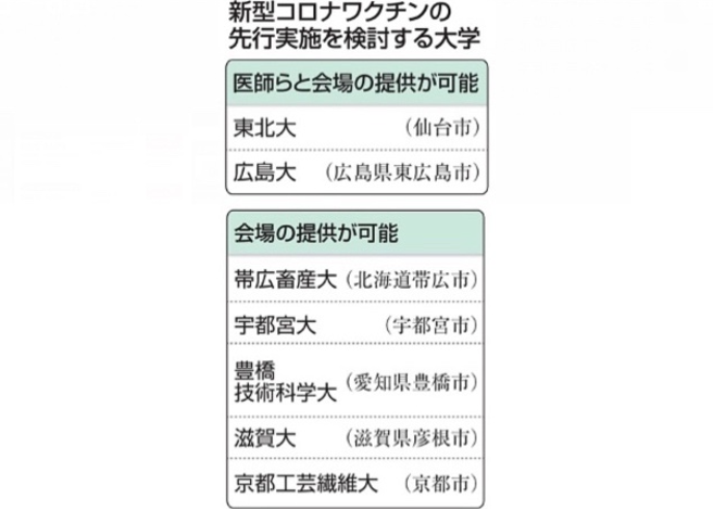 针对接种疫苗的医务人员与实施地点,日本全国约有350所大学已表示愿意配合政府,提供校园作为新冠疫苗的接种场地。6月1日,日本政府公布了7所国立大学作为疫苗接种会场,其中東北大、広島大可同时提供医护人员及会场,帯広畜産大(北海道帯広市)、宇都宮大(宇都宮市)、豊橋技術科学大(愛知県豊橋市)、滋賀大(滋賀県彦根市)、京都工芸繊維大(京都市)则只可能提供会场。
