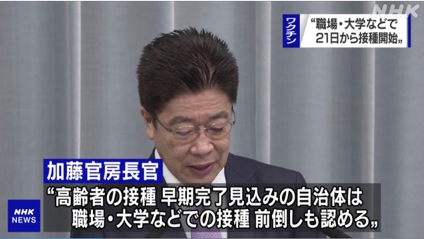 且如果对65岁以上的高龄人群的接种目标提前完成,各个自治体可以根据实际情况提前展开下一步的工作,因此,面向部分大学的接种计划或有可能早于21日实施。