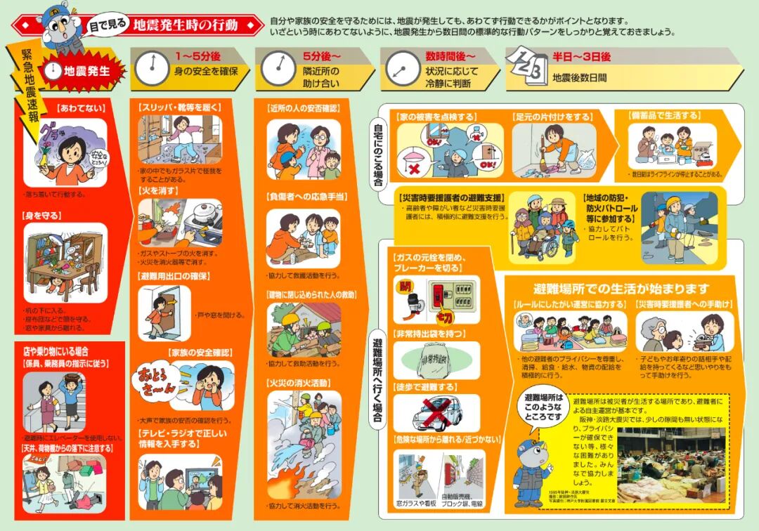 在家中避难的情况下,仔细检查水电煤气等线路的损坏情况,用自己事前准备好的防灾物资等待水电煤气等的重新供给。避难所为受害地区居民自主运营的生活场所。在前往避难所时,保证家中的燃气和电气已经关闭,带好“非常用持ち出し袋”,注意路上的坠落物等。