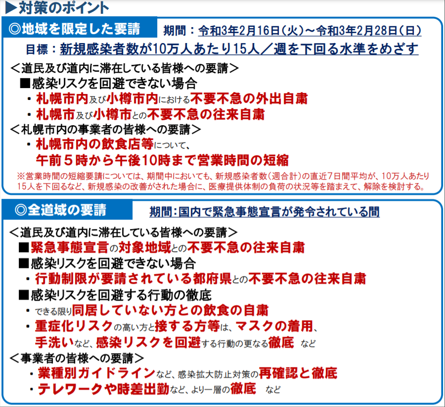本次的“集中对策期间”政策分为两个部分。一是针对札幌市和小樽市市民以及饮食店从业者的请求,该项实施期间为2月16日到2月28日;二是对于全体道民的请求,该项实施期间同日本国内紧急事态宣言一致(原定2月7日结束的10个都府县的紧急事态宣言已延长至3月7日)。