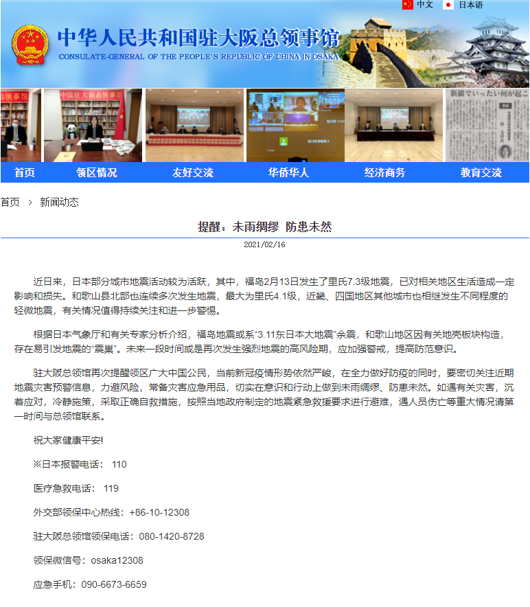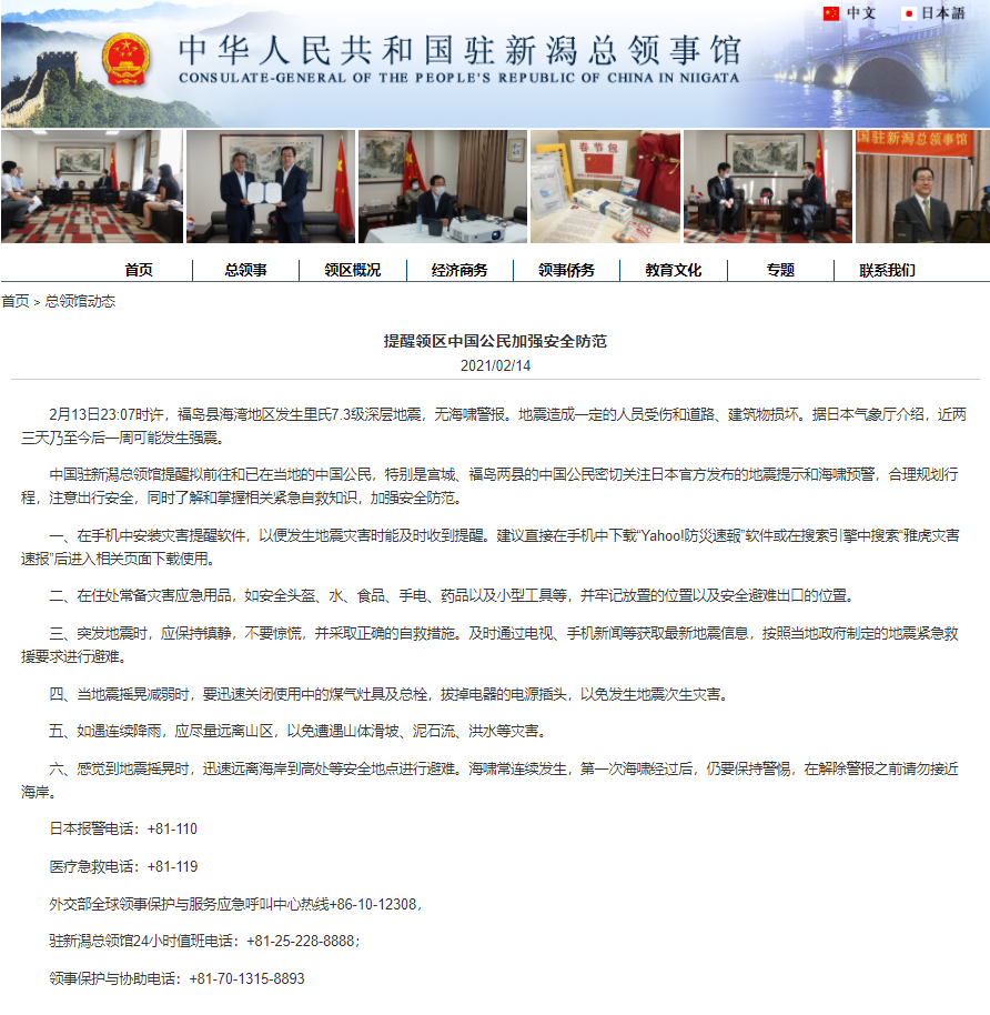 中国驻新潟总领馆提醒拟前往和已在当地的中国公民,特别是宫城、福岛两县的中国公民密切关注日本官方发布的地震提示和海啸预警,合理规划行程,注意出行安全,同时了解和掌握相关紧急自救知识,加强安全防范。