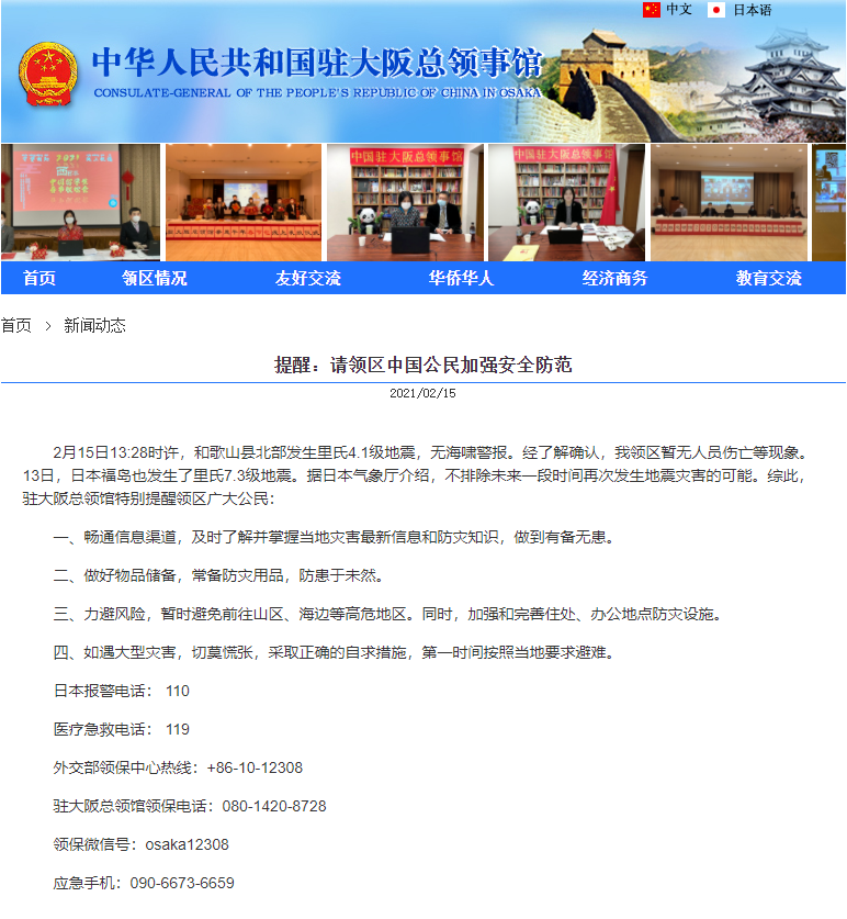 2月15日13:28时许,和歌山县北部发生里氏4.1级地震,无海啸警报。经了解确认,我领区暂无人员伤亡等现象。13日,日本福岛也发生了里氏7.3级地震。据日本气象厅介绍,不排除未来一段时间再次发生地震灾害的可能。综此,驻大阪总领馆特别提醒领区广大公民: