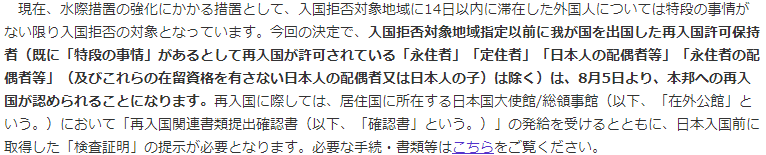 日本外务省于29日宣布,从8月5日开始,将对持有日本在留资格的驻在员和留学生,有条件地允许入境。对象是在日本宣布拒绝入境(4月2日)前,取得了再入国许可之后离开日本,且拥有在有效期内的在留资格的外国人。