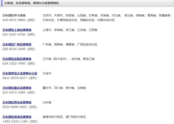 各省市或隶属不同大使馆、各总领事馆、领事办公室的管辖地区