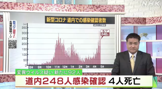 而近日北海道新冠病毒感染人数也呈递增趋势,5月7日新增病例达248人(其中札幌136人)。其中,领区内出现首例中国留学生确诊病例,维持了一年多的“零感染”被打破。